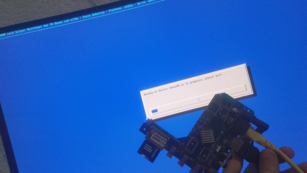 Para começar o processo, precisei de um cartão de memória com espaço suficiente para a imagem do Armbian, que pesa pouco menos de 2GB. Tendo o cartão em mãos, você irá precisar de baixar e extrair a ferramenta Multitool. Após extrair o Multitool, você terá um arquivo multitool.img, este arquivo deverá ser gravado no cartão de memória usando algum programa como o balenaEtcher por exemplo. Após gravar a imagem insira o cartão de memória em sua TV Box e espere pelo boot – Pode demorar um pouco na primeira vez, pois ele precisa redimensionar a partição no cartão de memória. Após carregar o multitool, você pode fazer um backup da imagem atual do sistema, caso queira restaurá-la posteriormente.
