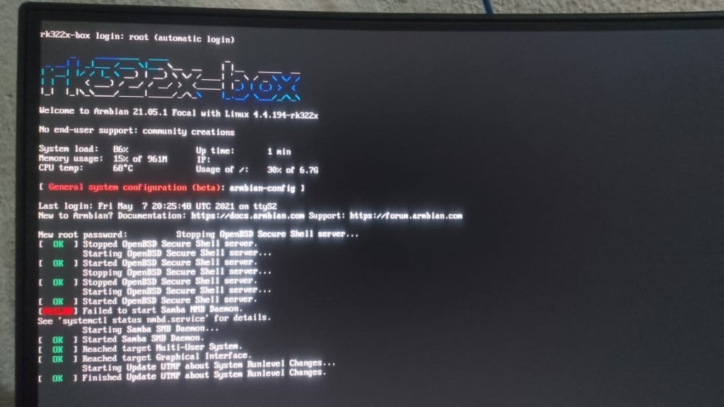 Após gravar a imagem, desligue a TV Box, remova o cartão de memória e a ligue novamente. Após alguns segundos você deverá começar a ver alguma ação de boot e, após mais algum tempo, deverá ver uma tela com um prompt de configuração.